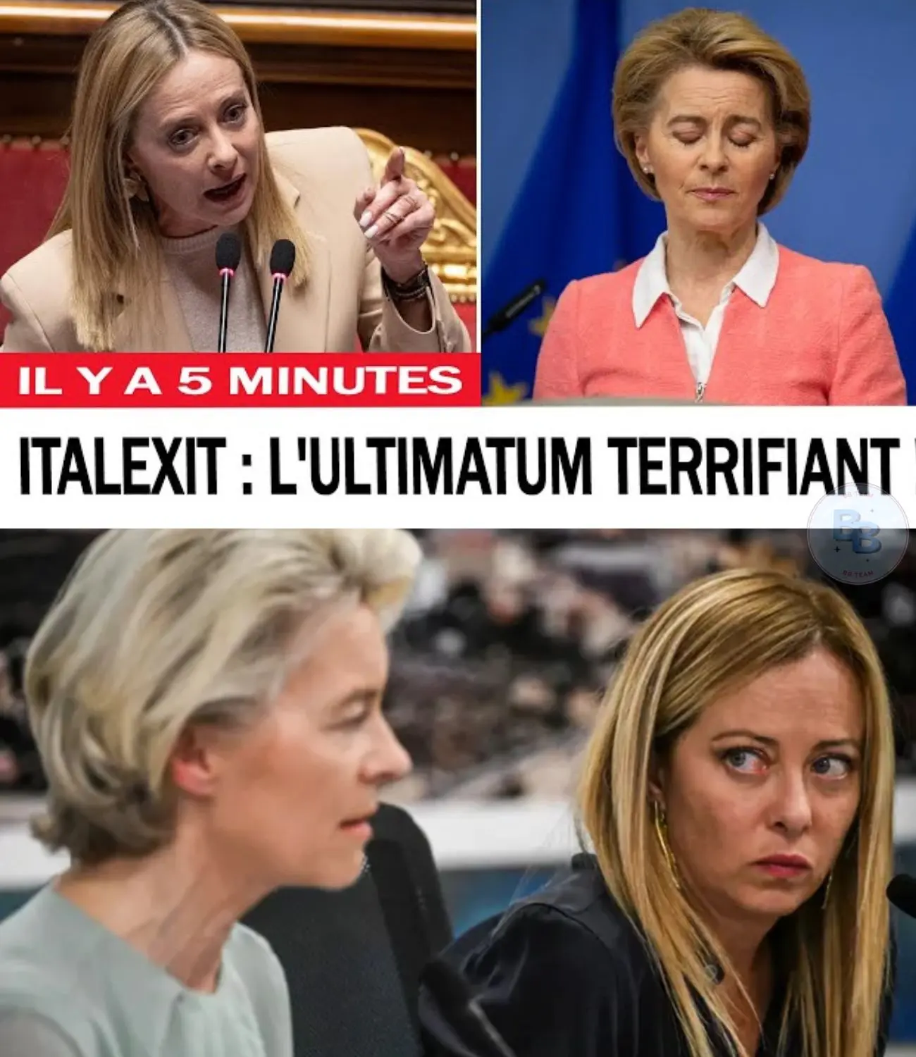Selon des vidéos virales circulant sur YouTube et les réseaux sociaux depuis juillet 2025, la Première ministre italienne aurait lancé un ultimatum lors d’un sommet informel à Bruxelles : “Si l’UE persiste dans cette voie anti-démocratique, von der Leyen doit partir pour laisser place à une Commission respectueuse des nations souveraines”.